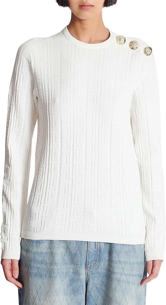 Made in Italy, this monogram-knit top from Balmain is styled with button accents at the shoulder.