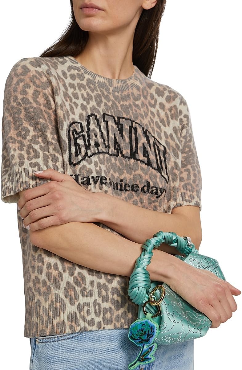 Crafted of a wool and nylon blend, this crewneck T-shirt is adorned with a leopard print pattern and features a signature Ganni logo on the chest.