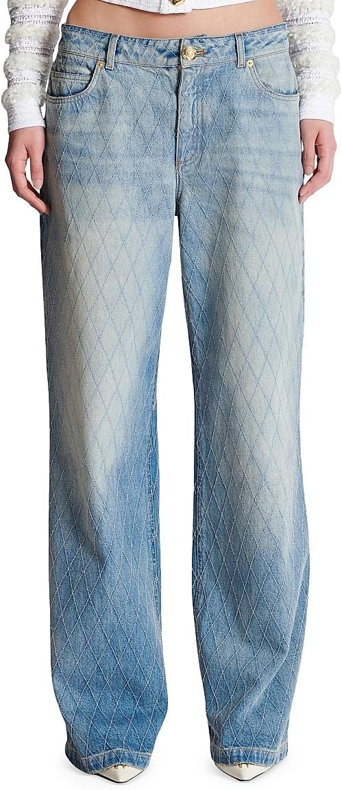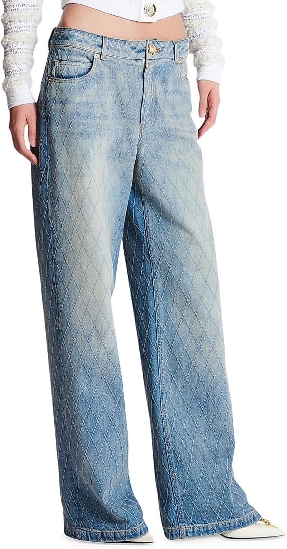 Balmain’s jeans feature diamond-quilted motifs and a straight-leg silhouette.