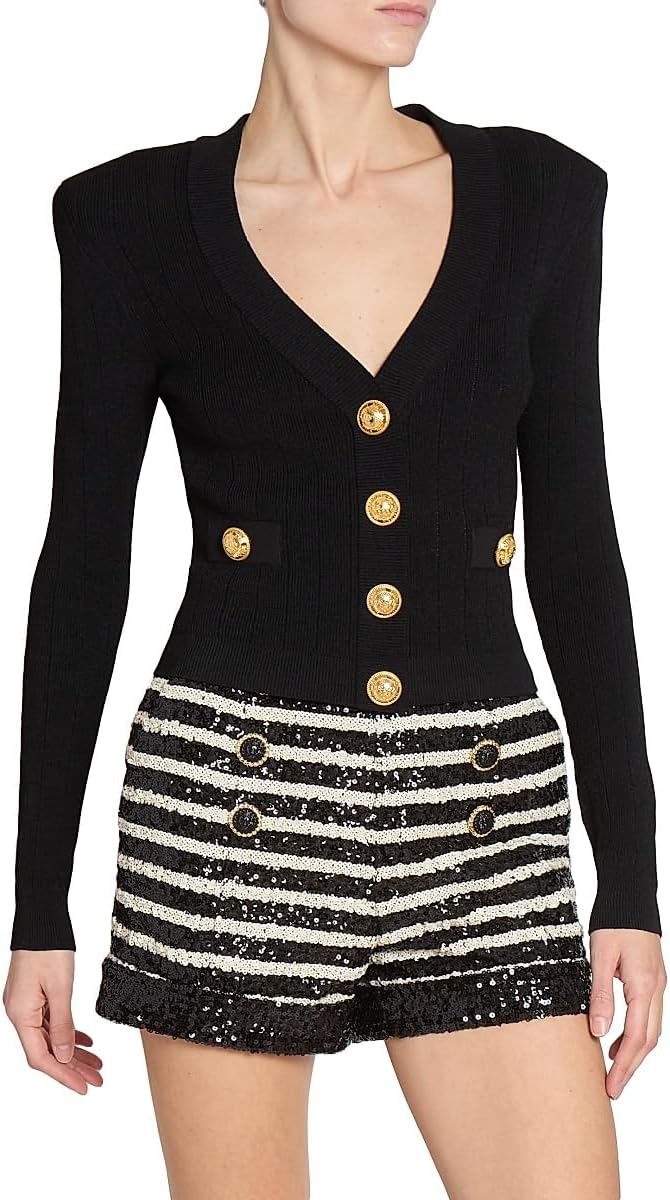 Crafted in France, Balmain’s fitted rib-knit cardigan flaunts mock welt pockets and a deep V-neck. This charming piece features padded shoulders and signature engraved goldtone buttons.