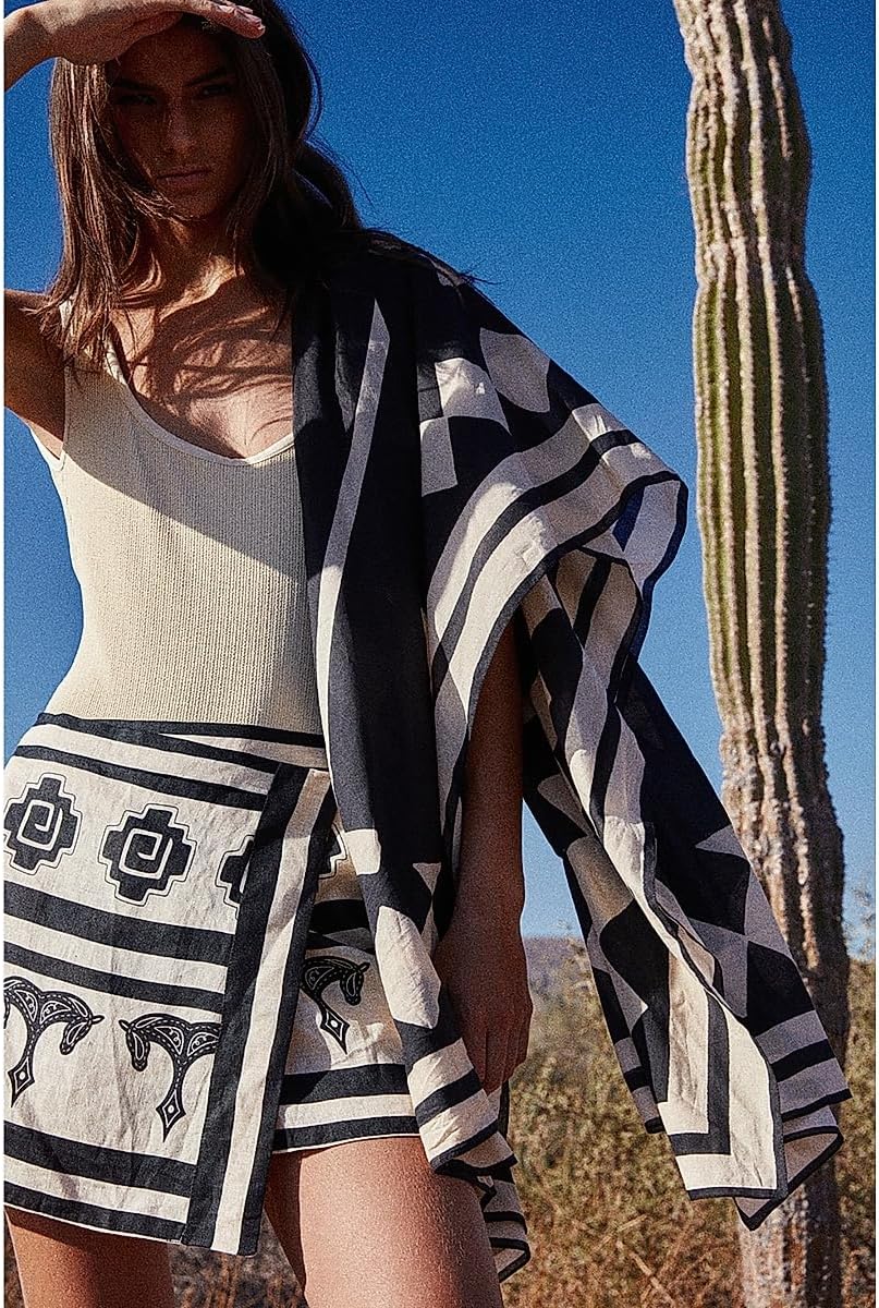 From the La Paz Summer Vacation Collection. Crafted of lightweight linen, Johanna Ortiz’s Roots wrap skirt features a striking geometric print and border stripe.