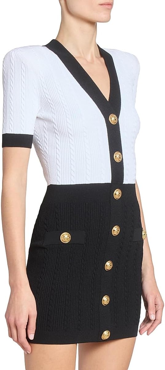 Cut in a sheath silhouette, this two-tone minidress from Balmain is designed with goldtone decorative buttons, faux pockets, and a classic torsade-knit pattern.
